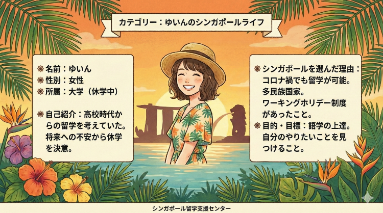 はじめまして。一年間大学を休学し、シンガポールで語学留学&ワーホリ中のゆいんです!