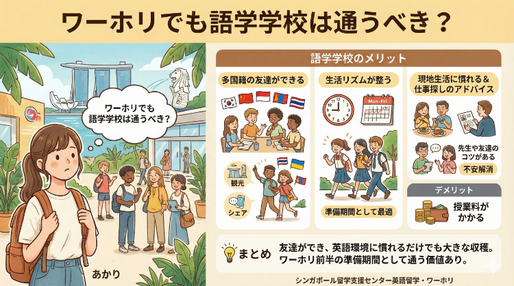 学校に通ったことで、余裕を持ってシンガポール生活に慣れることができたと思います。シンガポールに着いてすぐに英語の環境で職探しなどをするのは大変だっただろうと感じます!実際に到着してから学校が始まるまでの三日間だけでも孤独でした💦