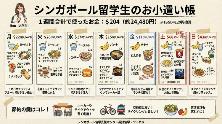この週は、友人とナイトサファリに行ったりしたのでいつもよりお金がかかりました。