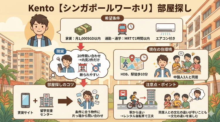 賃貸サイト等で部屋探しをする際に、シンガポール留学支援センターの方に上記の条件を相談し、条件に合うものを定期的に提案してくれるので、自分でもいい物件を探しつつ、提案していただいた物件に片っ端から問い合わせをするという作業でした。