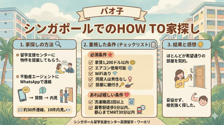 シンガポールの大手賃貸サイトで探しました。しかし自分だけで0から探したわけではなく、シンガポール留学支援センターの方に部屋の条件を相談したら、サイト内で条件に合うものを定期的に提案していただきました。提案していただいた物件の不動産エージェントに片っ端からWhats appで問い合わせて内見、質問の繰り返しをしました。私は約30件問い合わせて10件内見し、最終的に気に入った物件と契約しました。