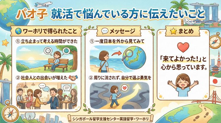 私はシンガポールワーホリを決めるまでとても悩んだ話を始めの方にしました。大学3年次に約一年の就職活動を経験した後にワーホリを決めたため、私と同じように将来について悩まれている方へこんな選択をした人間もいるよということをお伝えできればいいなと思います!