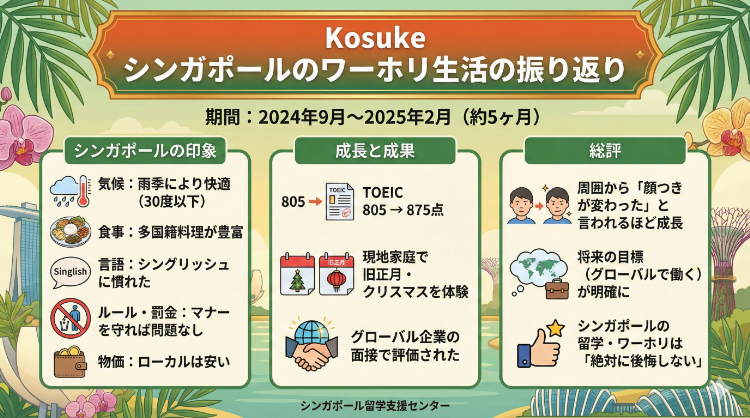 このシンガポールでの経験は、現在行なっている就職活動でも高く評価され、特にグローバル企業の面接官の人からはとても良い評価をいただけました。その結果、先日納得内定をいただくことができ、2026年からは自分がやりたいグローバルな働き方ができそうです。
