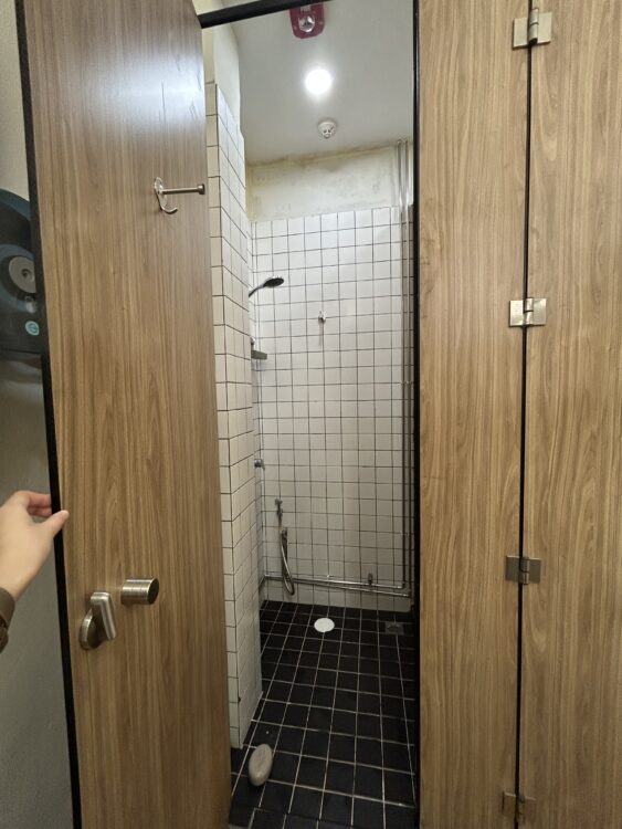 → シャワールームに服を置くスペースがなく、フックにハンガーを掛けて服を吊るしていました。