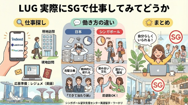現在シンガポールでワーホリ中のルグ(LUG)です!今年2025年の3月に大学を卒業し、8ヶ月正社員として働いて退職してからシンガポールに来ました。今はフルタイムで週5日で日系企業のレストランで働いています。