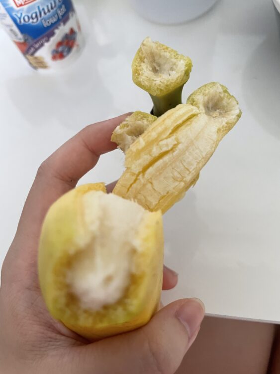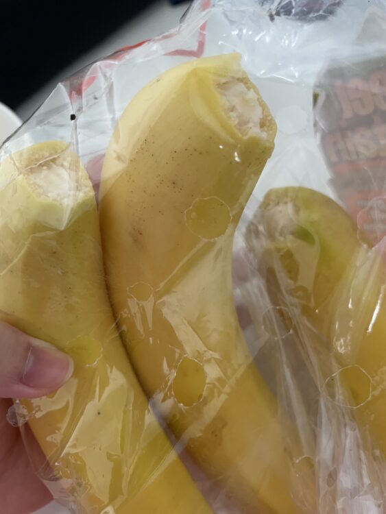 上記の画像はシンガポールでバナナを食べようとするとよく起こるあるあるになります。一本とろうとすると、他のバナナのヘタも持っていかれます。ラップは買ってなかったので、キッチンペーパーで禿げた部分だけ覆って輪ゴムで縛ってました。