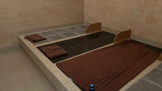 岩盤浴の部屋はいくつか複数に分かれていて、わたしはそのうちの1つの『春』という部屋に案内されました。春夏秋冬で分けられているようです。お部屋のイメージはこのような感じで、わたしが着替え終わるまでにタオルを敷いてくれていました。ドリンクも同様に準備してくれていました。