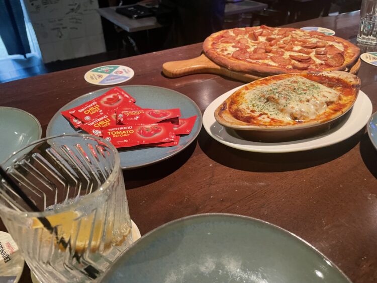 こんな感じで料理もパーティサイズのものもあれば、ビールをサーバーごと頼めるシステムもありました。おすすめは黒板に書かれてて、ピザとバケツでくるチキンウィングと何かが確かオススメに載ってた気がします。
