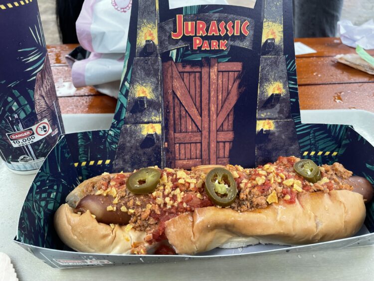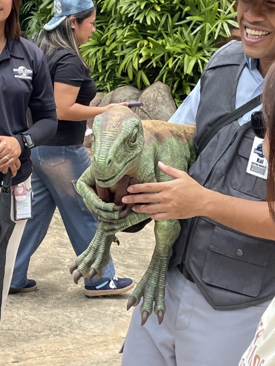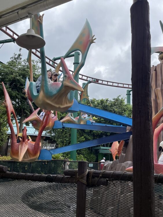 その次はジュラシックパークへ行ったのですが、あいにくあの人気アトラクション、ボートに乗ってジュラシックパーク観光は運転停止してたので、他ので遊びました。途中で雨も降っては止んだりで、このボートのやつ乗る乗らないに関わらずカッパ、レインコートは必須でした。あ、ここのソーセージ美味しかったです。