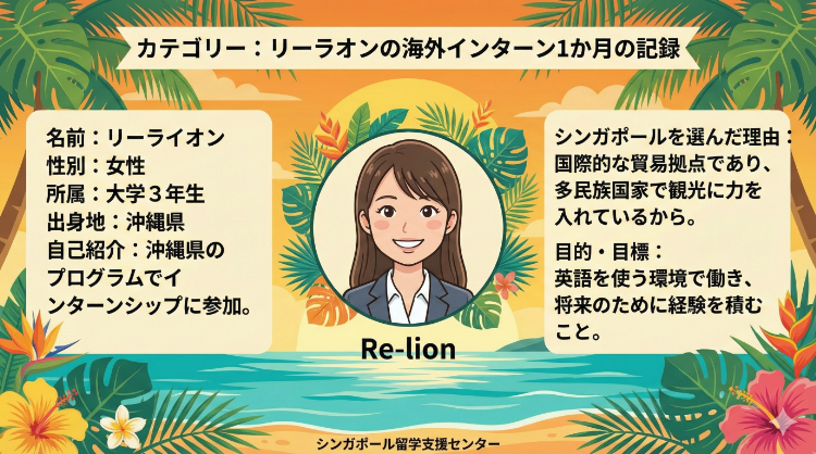 私は、現在沖縄県のプログラムを利用し海外インターンシップに参加している大学3年生のリーライオンです。