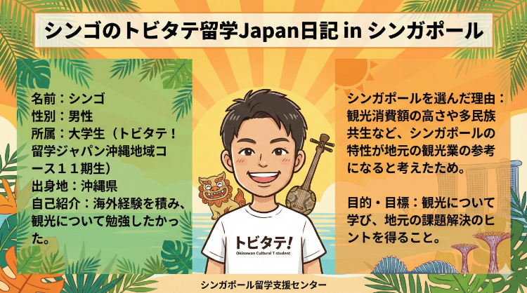 - 「トビタテ!留学JAPAN」でシンガポールに3ヶ月滞在する大学生。滞在中は語学学校1ヶ月&インターンシップ2ヶ月を予定。地元沖縄の発展に結びつくヒントを探しに来ました。